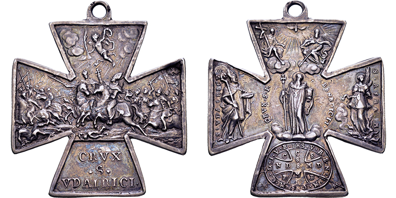 AUGSBURG, FREIE REICHSSTADT Ulrichskreuz o.J. (18. Jh.; unsigniert). Ungarnschlacht. Rs: Dreifaltigkeit über St. Benedict zwischen St. Ulrich und der Hl. Afra, unten Benediktusschild. Friesenegger 290. Mit Tragöse und Punze. Schöne Patina. 46,5 x 46,3 mm; 14,05 g. R vz