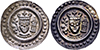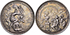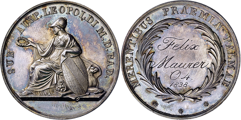 BADEN, GROSSHERZOGTUM Karl Leopold Friedrich. 1830-1852, Schulprämie o.J. für die obere Vorschule und die Sexta (Doell) mit Gravur \"W. / Maurer / C . 9. / 1834\" (24,3 mm). Dazu desgl. für die Mittelstufe (Kachel) mit Gravur \"Felix / Maurer / O. 4. / 1838\" in Palmkranz (32,8 mm). WZ 265 u. 269. Schöne Patina. 2 St. fast St