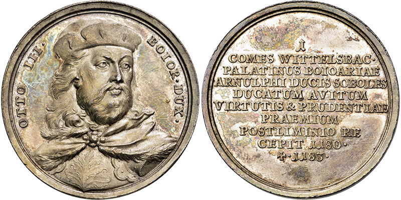 BAYERN, HERZOGTUM Otto III. (I.) von Wittelsbach. 1180-1183, Suitenmedaille o.J. (1766/67-70; Stempel von Franz Andreas Schega). Geharnischte Büste fast von vorn mit Fürstenhut. Rs: 10 Zeilen Schrift unter der Serien - Nr. 1. Witt. 16. Grotem. 40. Schöne dunkle Patina. Winzige Randfehler und Kratzer. 39,7 mm; 29,25 g. vz-fast St